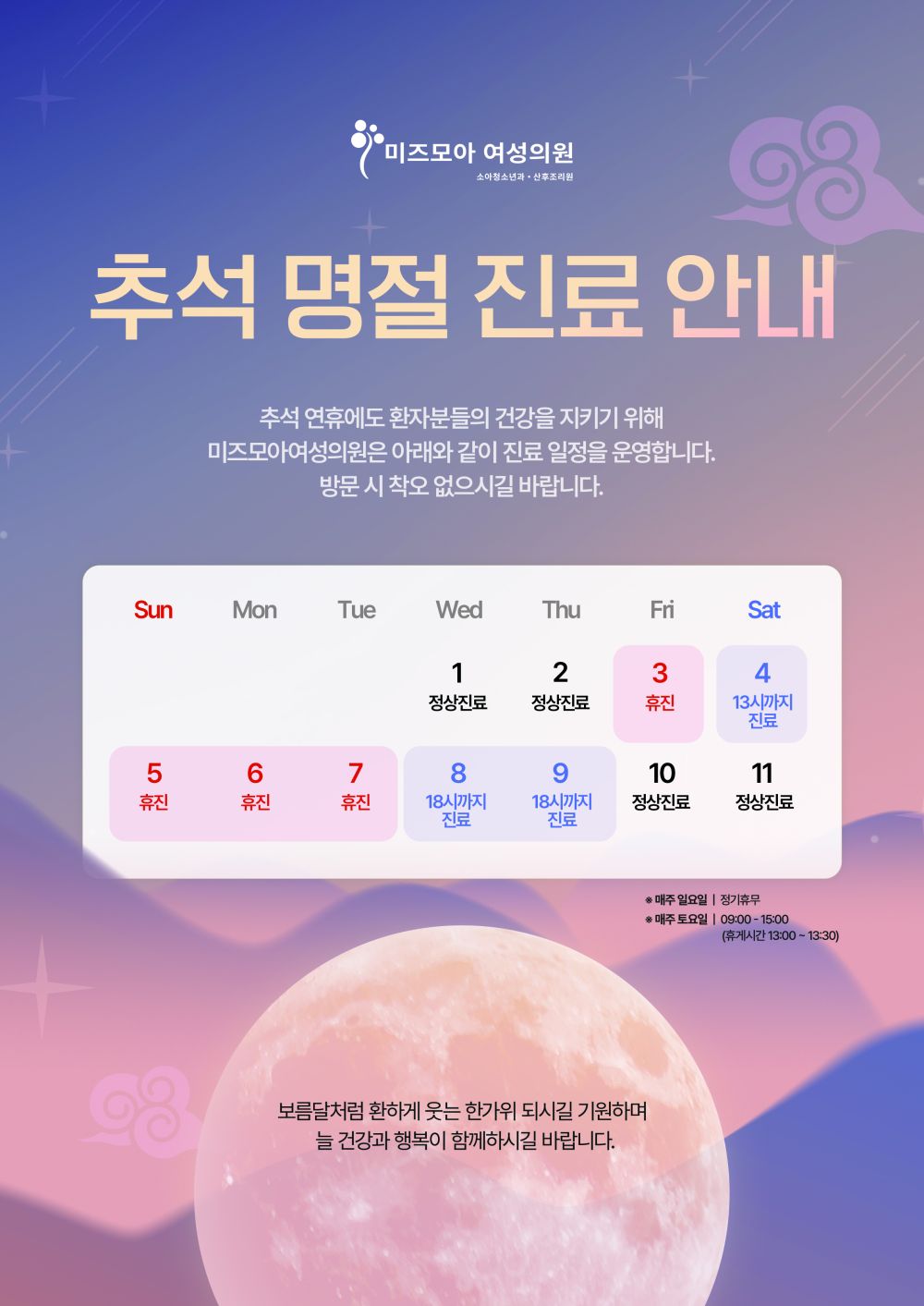 10월 휴진안내 입니다. 관리자 25-09-26 09:23 페이지 정보 목록목록 본문 10월 3일 개천절 휴무 10월 4일 토요일 1시까지 진료10월 6월 7일 휴진 입니다.10월 8일 9일 6시까지 진료10월 10일부터 정상진료 합니다. ^^보름달처럼 환하게 웃는 한가위 되시길 기원하며 늘 건강과 행복이 함께 하시길 바랍니다. 이전글12월 휴무 안내 25.12.11